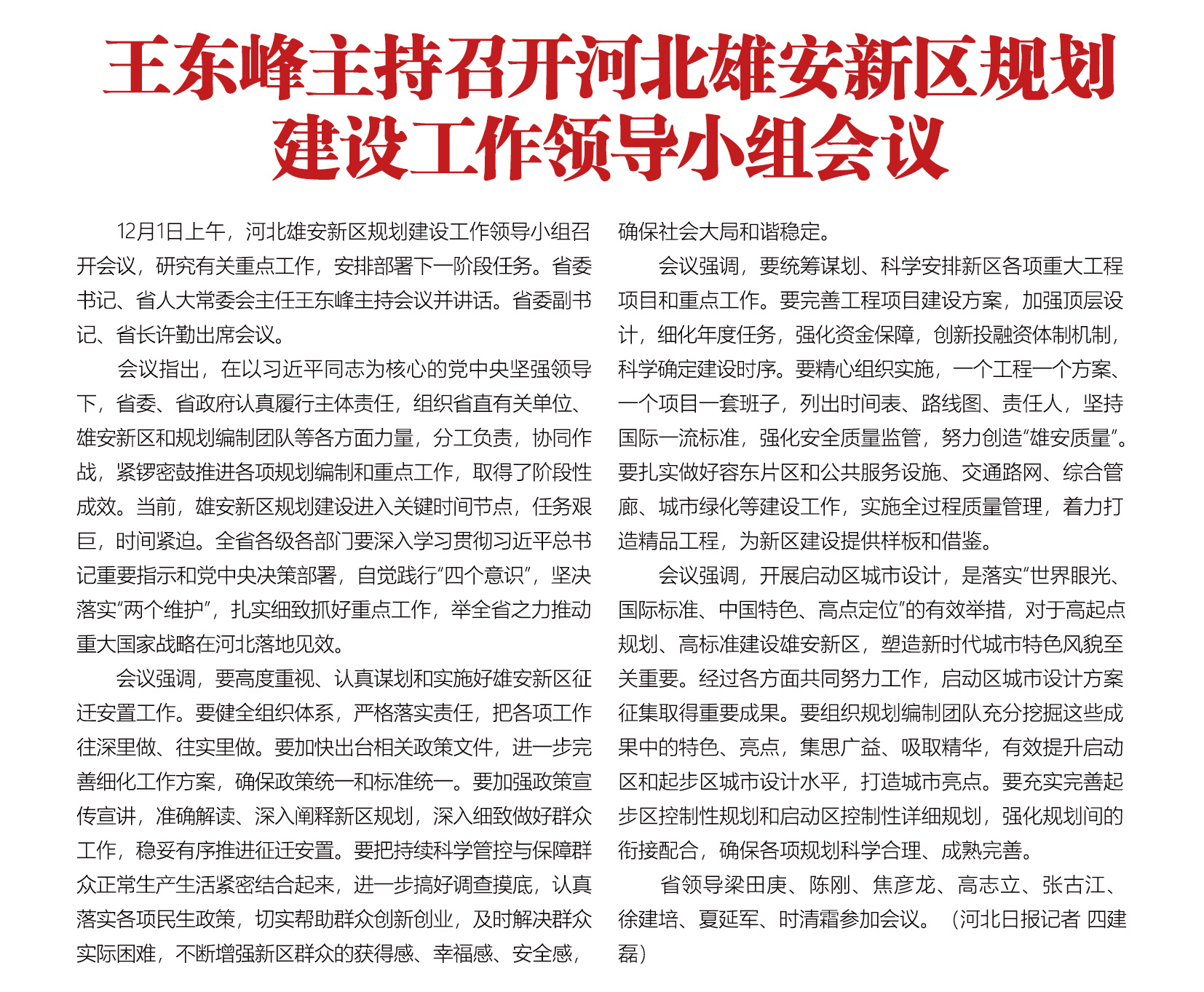 12月1日上午,河北雄安新区规划建设工作领导小组召开会议,会议强调,要高度重视、认真谋划和实施好雄安新区征迁安置工作。要健全组织体系,严格落实责任,把各项工作往深里做、往实里做。