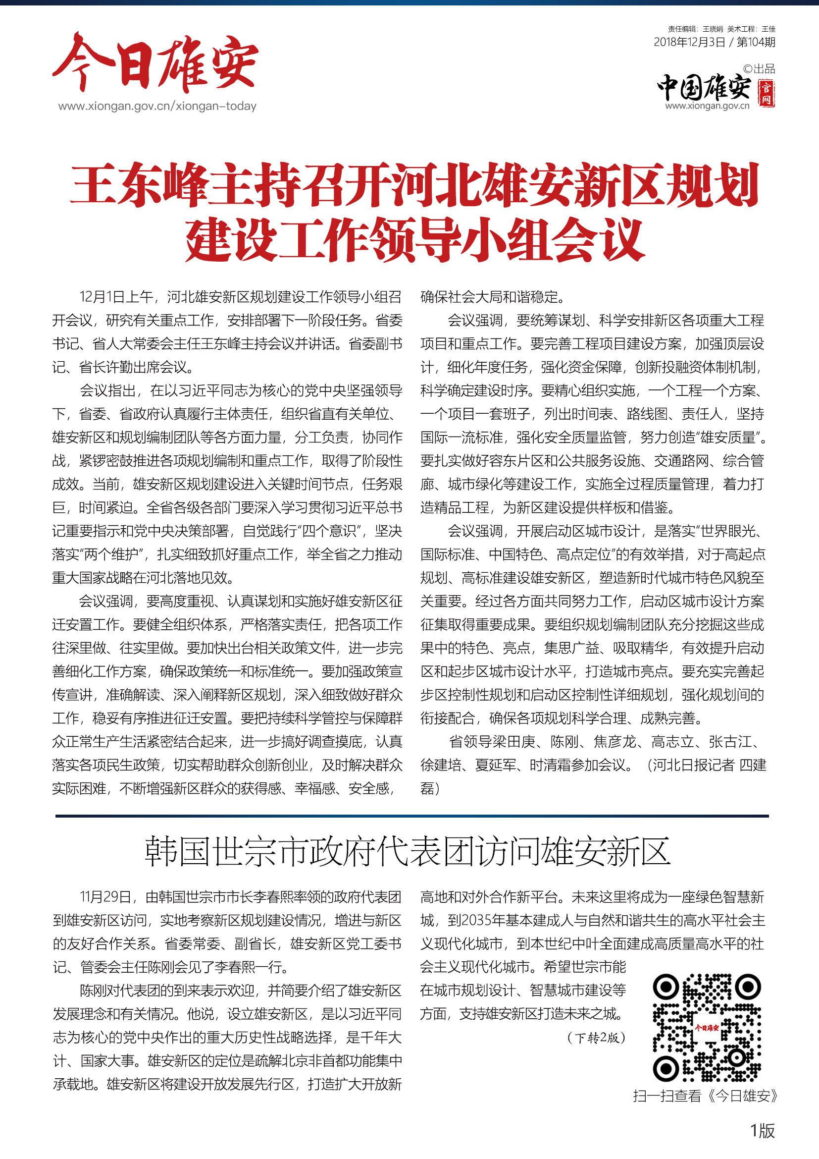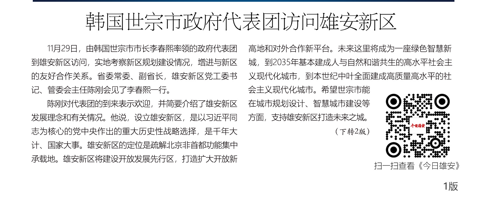 11月29日,由韩国世宗市市长李春熙率领的政府代表团到雄安新区访问,实地考察新区规划建设情况,增进与新区的友好合作关系。