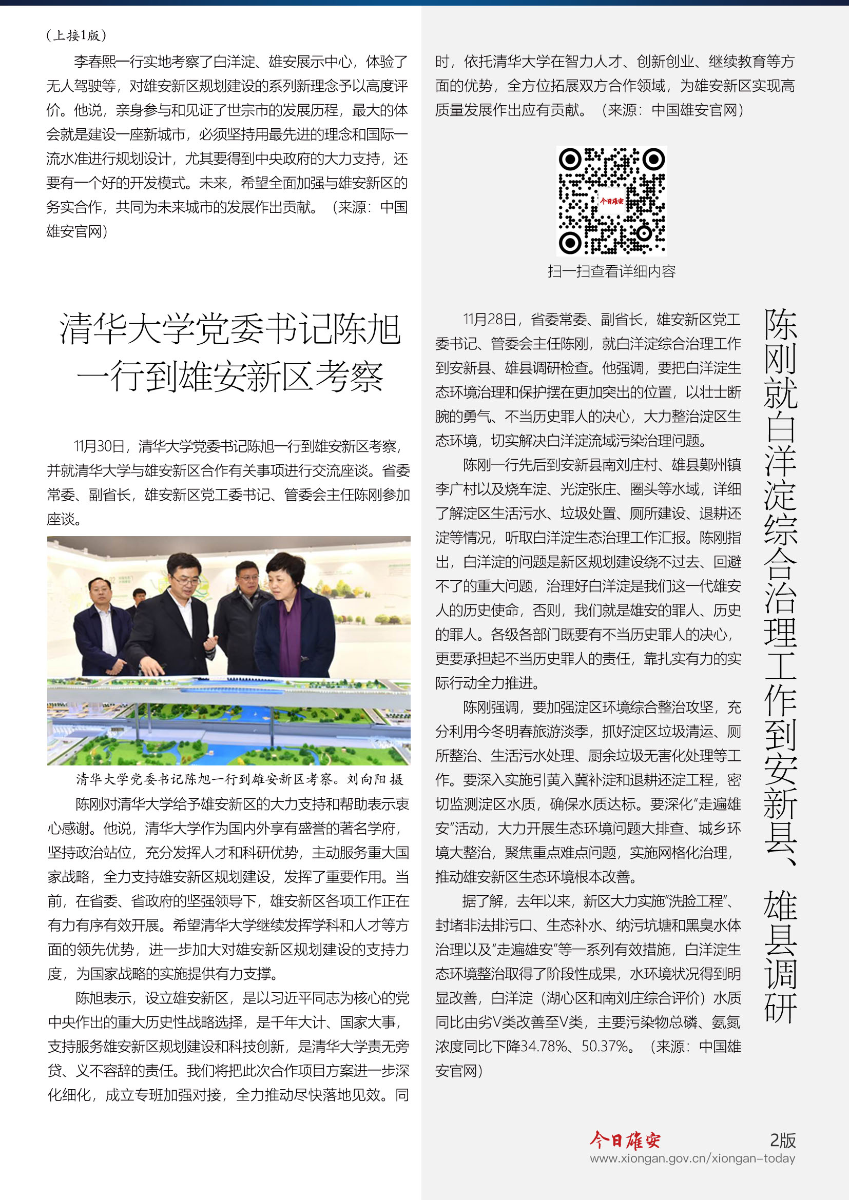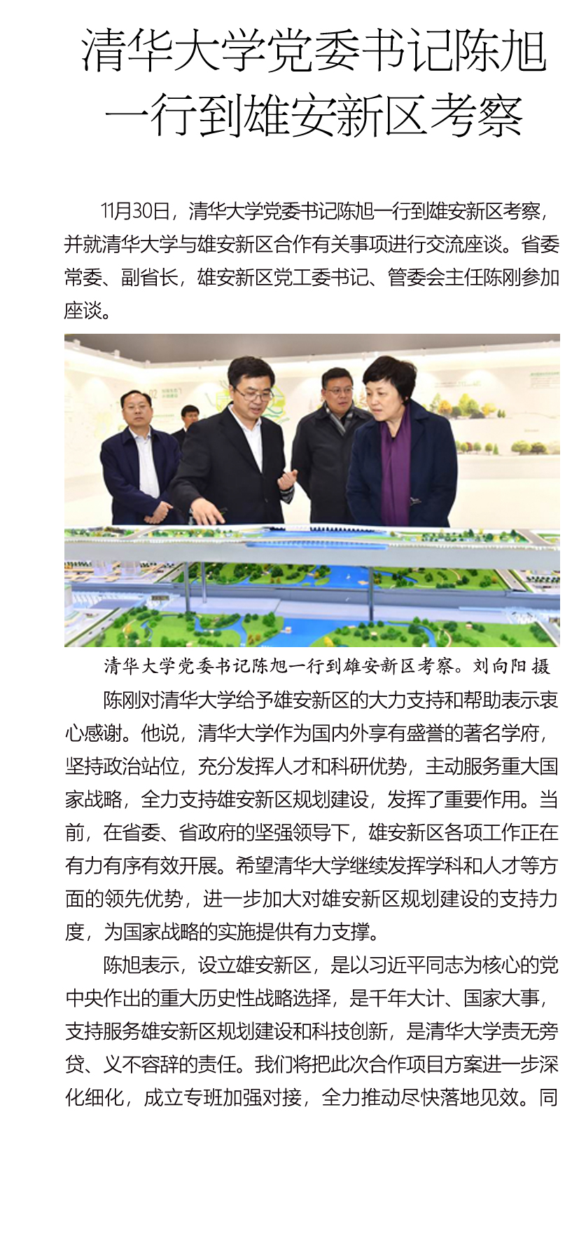 11月30日,清华大学党委书记陈旭一行到雄安新区考察,并就清华大学与新区合作有关事项进行交流座谈。