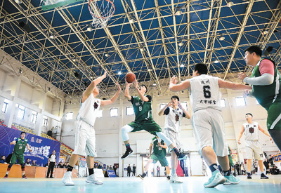 在京津冀篮球协会联盟“嘉都”杯篮球赛上,三河代表队球员在比赛中进攻。新华社记者鲁鹏 摄