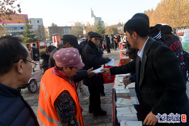 活动现场,工作人员为群众发放宪法宣传册。图片由雄县县委宣传部提供