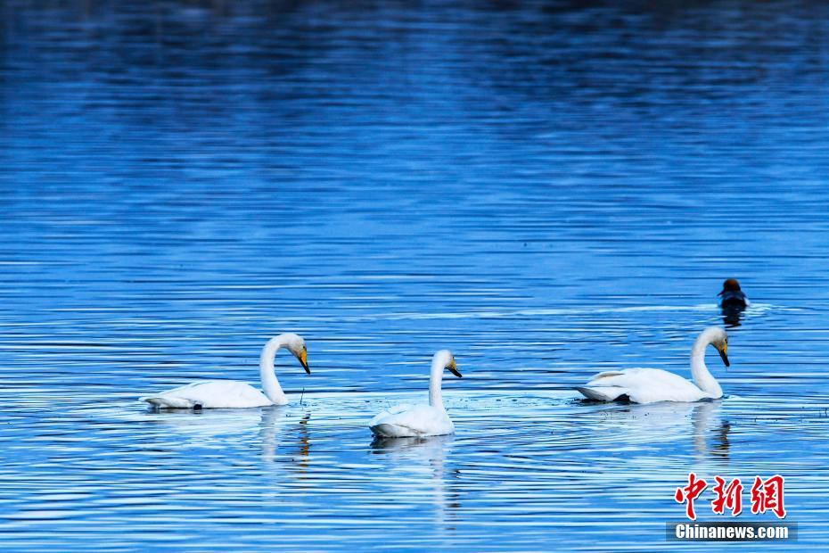 近日,青海省贵德县黄河湿地公园内,成群结队的天鹅群在岸边起舞嬉戏。今年,数百只天鹅迁徙到青海省贵德县黄河湿地越冬,为冬季的黄河增添了一份美丽与灵动。赵时春 摄
