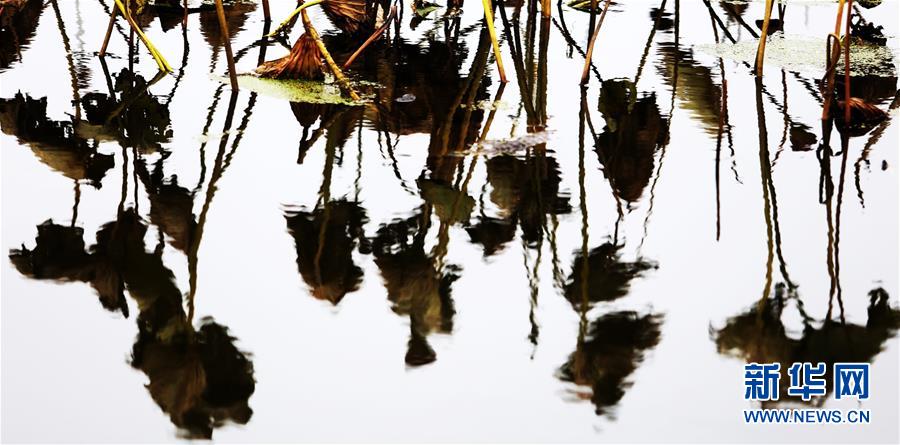 初冬时节,水中残荷仿佛一串串跳跃的音符,抒写着水墨韵美。新华社发(张春雷 摄)