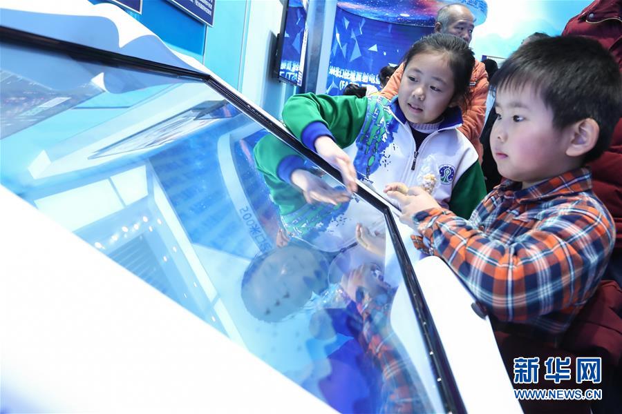 12月8日,两名小观众在展览上体验互动项目。 当日适逢寒冬周末,来到中国国家博物馆参观“伟大的变革——庆祝改革开放40周年大型展览”的观众热情饱满,单日参观人数再次突破5万。新华社记者 张玉薇 摄