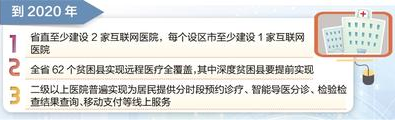 为大力发展远程医疗服务,实施意见提出,将建设省、市、县三级远程医疗综合管理和运营监管系统,推进远程医疗服务覆盖全省所有医疗联合体和县级医院,并向社区卫生服务机构、乡镇卫生院和村卫生室不断延伸,逐步建立功能完善、互联互通的远程医疗服务体系。以县域医共体为依托,在县域内积极推行“基层检查、上级诊断”的服务模式。到2020年,全省62个贫困县实现远程医疗全覆盖,其中深度贫困县要提前实现。在此基础上,推进移动医疗应用。到2020年,二级以上医院普遍实现为居民提供分时段预约诊疗、智能导医分诊、检验检查结果查询、移动支付等线上服务。