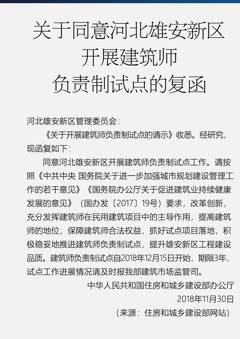 住房城乡建设部办公厅关于同意河北雄安新区开展建筑师负责制试点的复函发布。