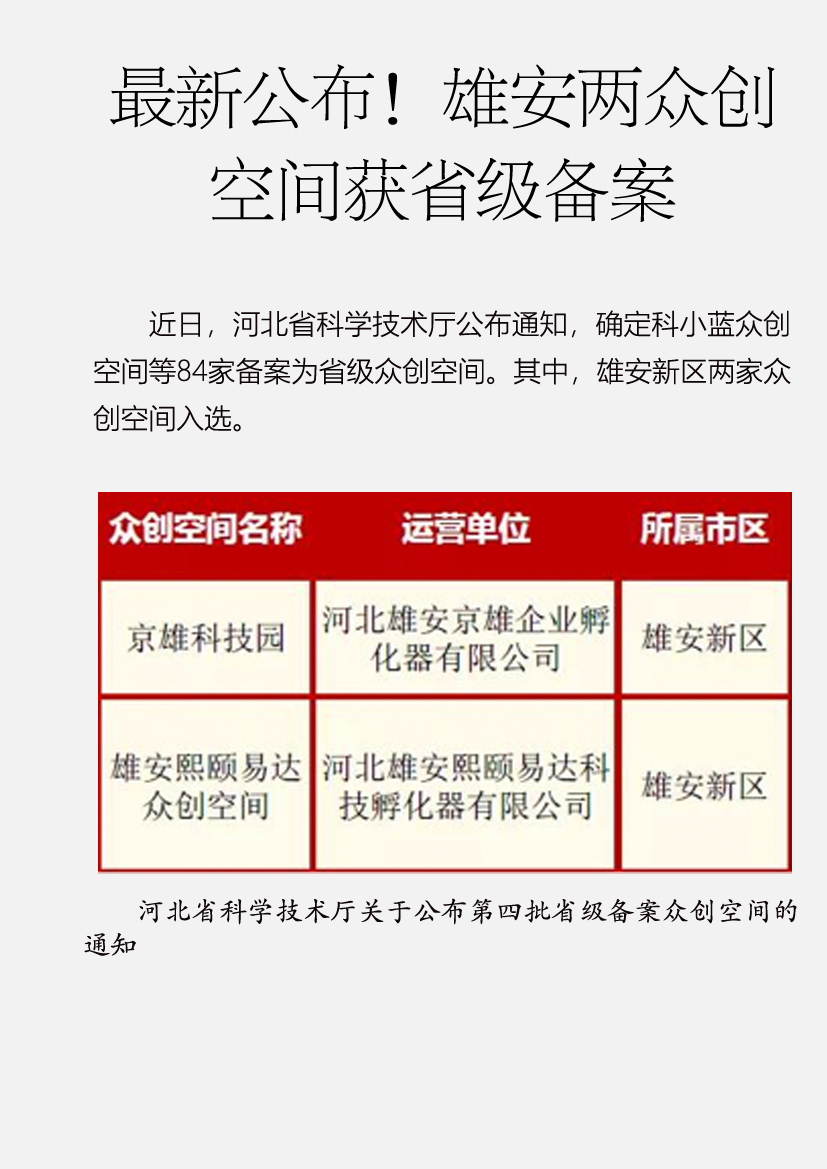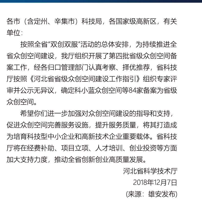 近日,河北省科学技术厅公布通知,确定科小蓝众创空间等84家备案为省级众创空间。其中,雄安新区两家众创空间入选,一起来看看都有谁吧。