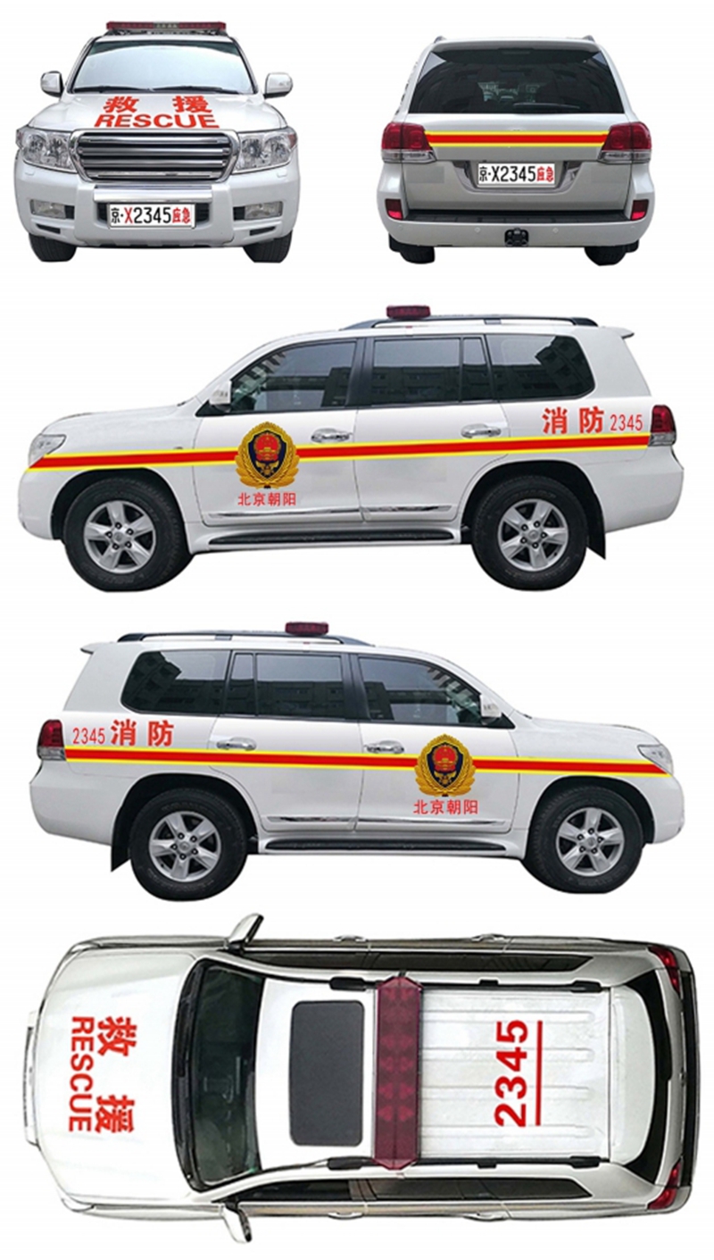 悬挂专用号牌车辆外观参照国际通行做法进行标识涂装,车身前面涂装“救援RESCUE”字样,车身侧面涂装国家综合性消防救援队伍徽标、“消防”字样和所属单位名称、车辆编号,车顶涂装车辆编号,车身两侧及车辆尾部涂装装饰条。