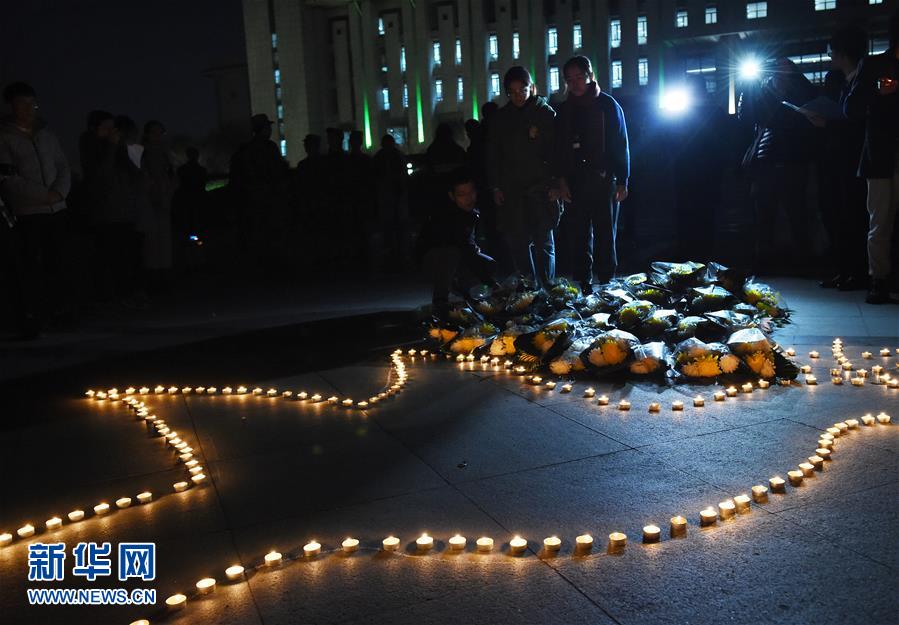 12月12日,学生在“烛光祭”活动现场献花。 当晚,南京东南大学学生在校园举行“烛光祭”活动,悼念南京大屠杀遇难同胞。学生们点燃白烛,献花默哀,表达哀思。 新华社记者 孙参 摄