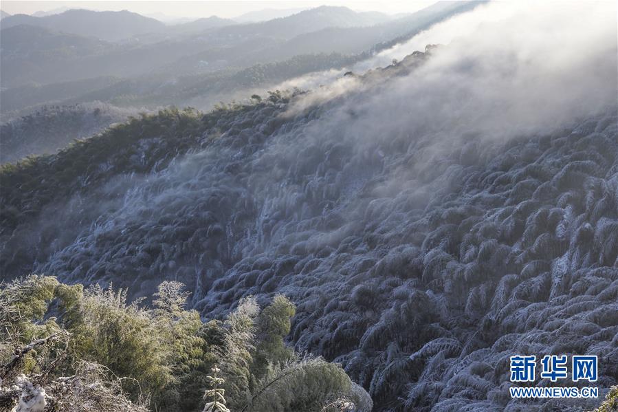 12月11日,吉林市松花江畔出现美丽的雾凇景观,沿江树木披上了洁白的银装。