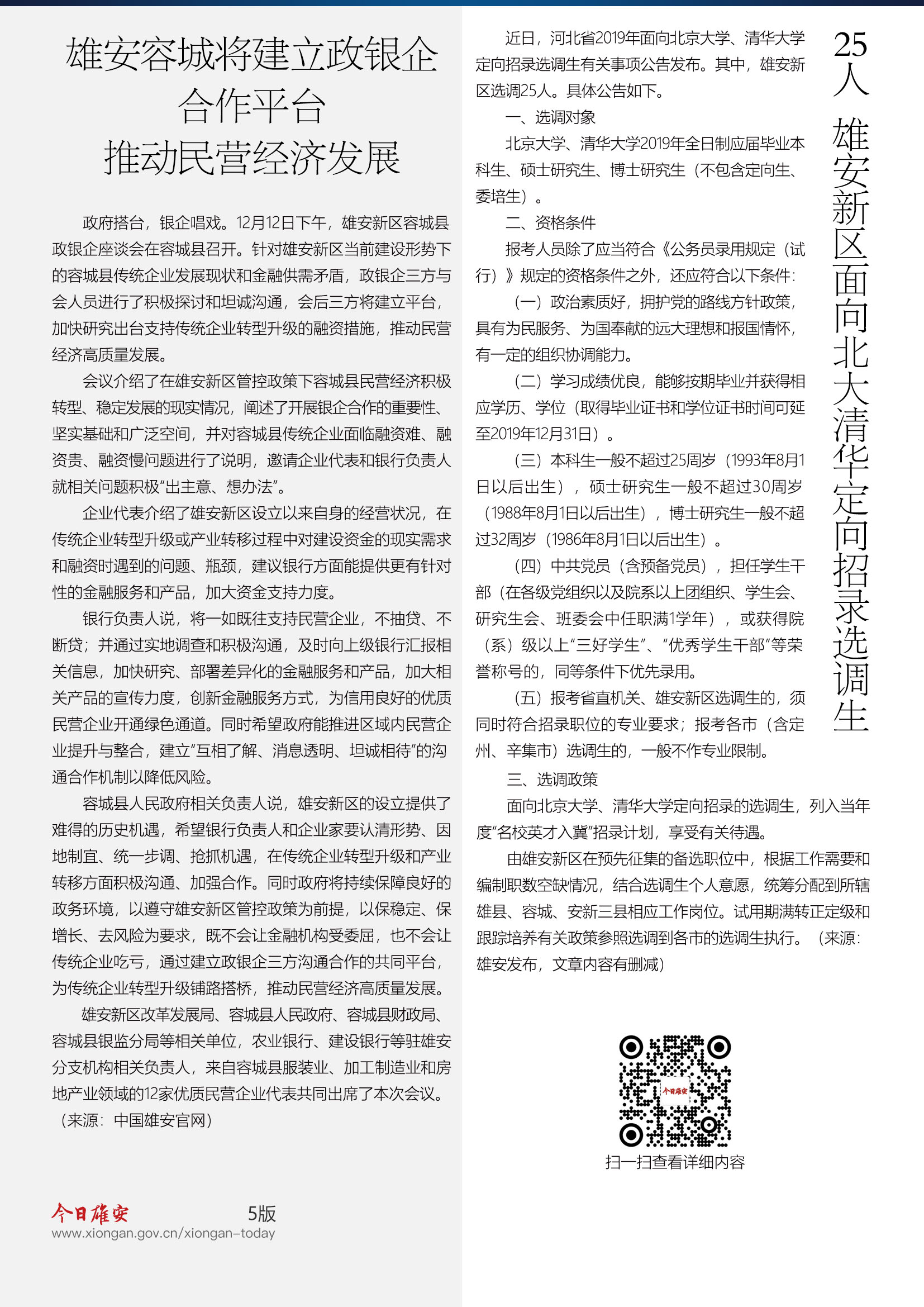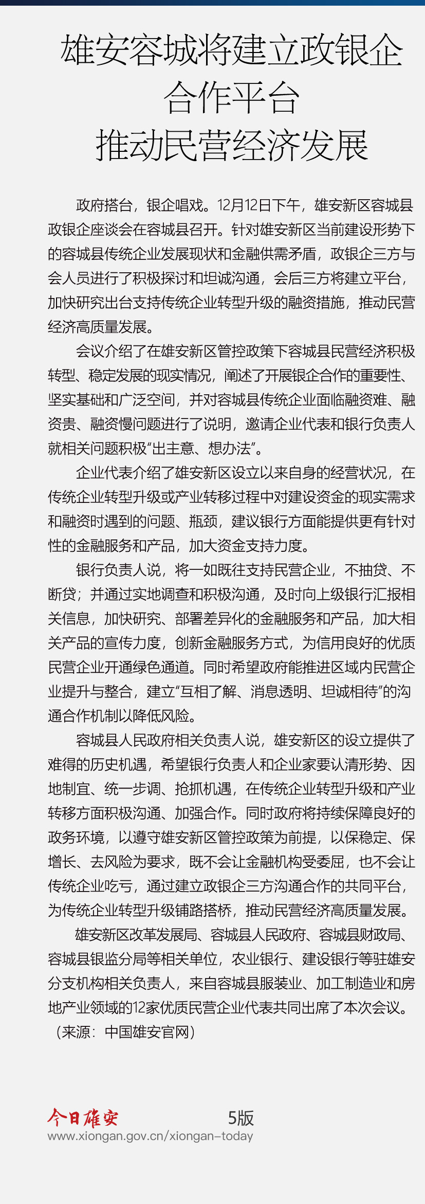 雄安容城将建立政银企合作平台 推动民营经济高质量发展