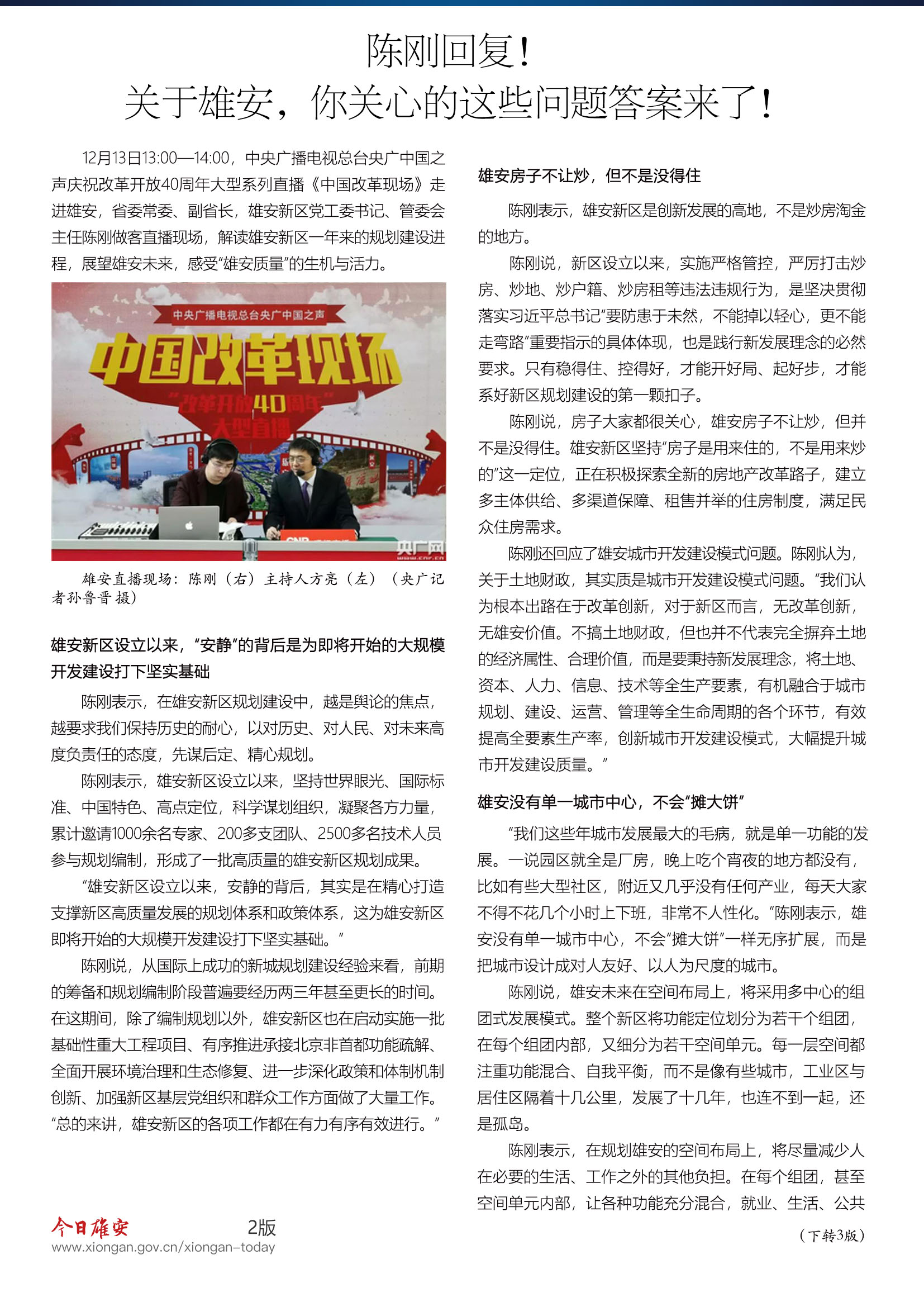 12月13日13:00—14:00,中央广播电视总台央广中国之声庆祝改革开放40周年大型系列直播《中国改革现场》走进雄安,省委常委、副省长,雄安新区党工委书记、管委会主任陈刚做客直播现场。