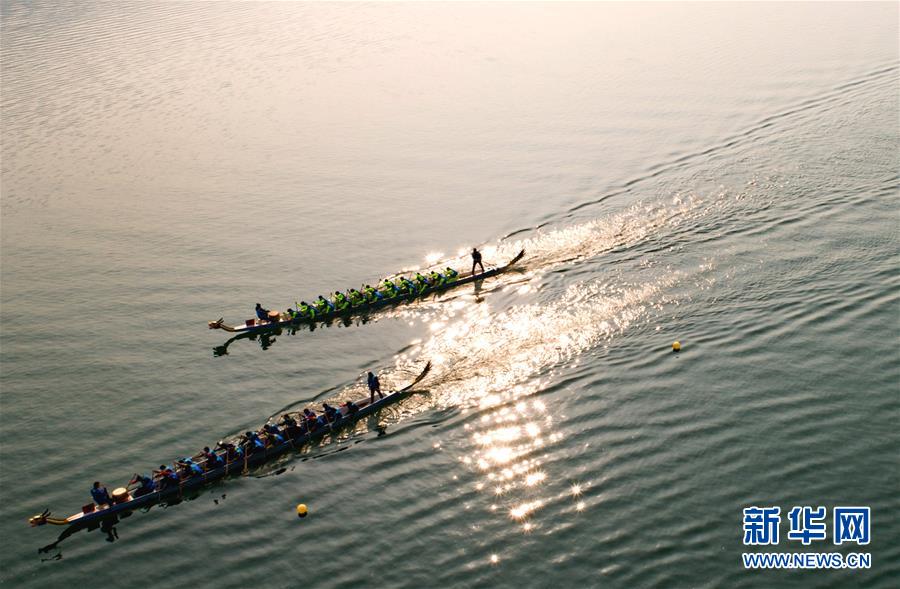 这是12月13日,人们在湖北省秭归县水田坝乡参加龙舟比赛(无人机拍摄)。 新华社发(王罡 摄)