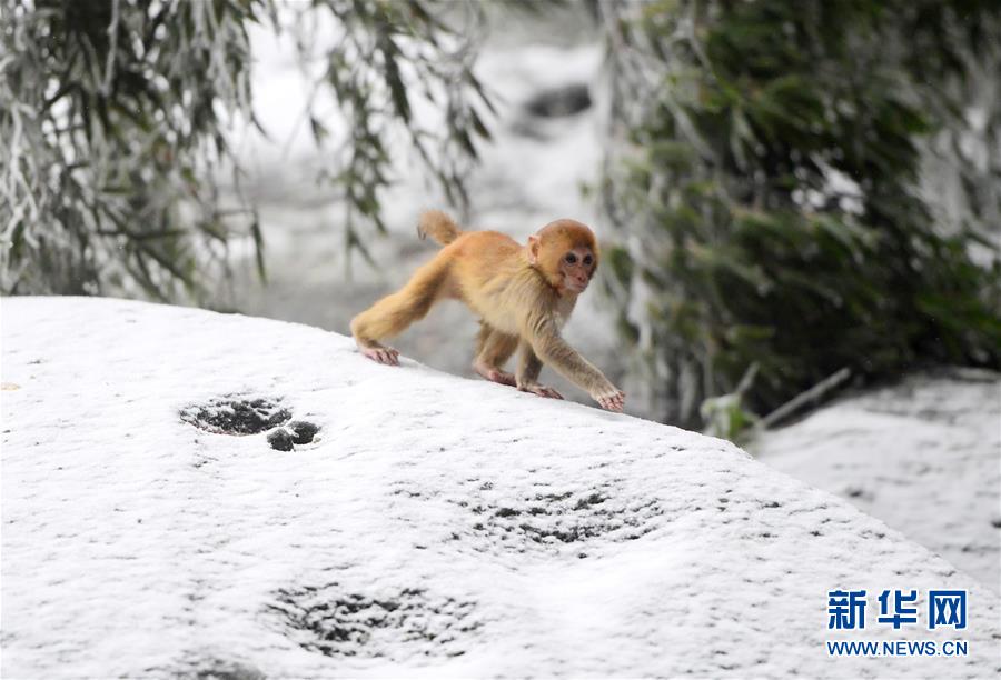 12月9日,在湖南省浏阳市大围山猕猴谷景区,一只猴子在雪中玩耍。 新华社发(彭红霞 摄)