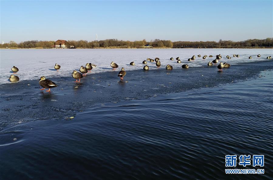12月14日,水鸟在唐山南湖的冰面上栖息(无人机拍摄)。