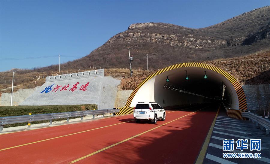 12月16日,一辆汽车行驶在京秦高速公路二期工程河北玉田境内的凤凰顶隧道路段(无人机拍摄)。