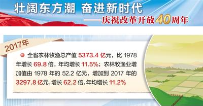 省统计局提供的数据显示,2017年,全省农林牧渔总产值5373.4亿元,比1978年增长69.8倍,年均增长11.5%;农林牧渔业增加值由1978年的52.2亿元,增加到2017年的3297.8亿元,增长62.2倍,年均增长11.2%。