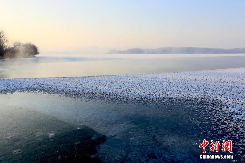 近日,受强冷空气影响,地处甘肃省河西走廊中段的张掖市降温降雪。该市滨河新区芦水湾景区的湖面结冰,冰面上自然形成的冰花,犹如朵朵白花盛开,铺满了湖面。图为湖面上寒气蒸腾,冰花漂浮在水面。陈礼 摄