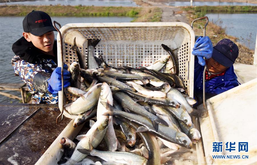 12月17日,安徽铜陵一家渔业公司的工作人员在装运捕捞的翘嘴鲌。 新华社发(过仕宁 摄)