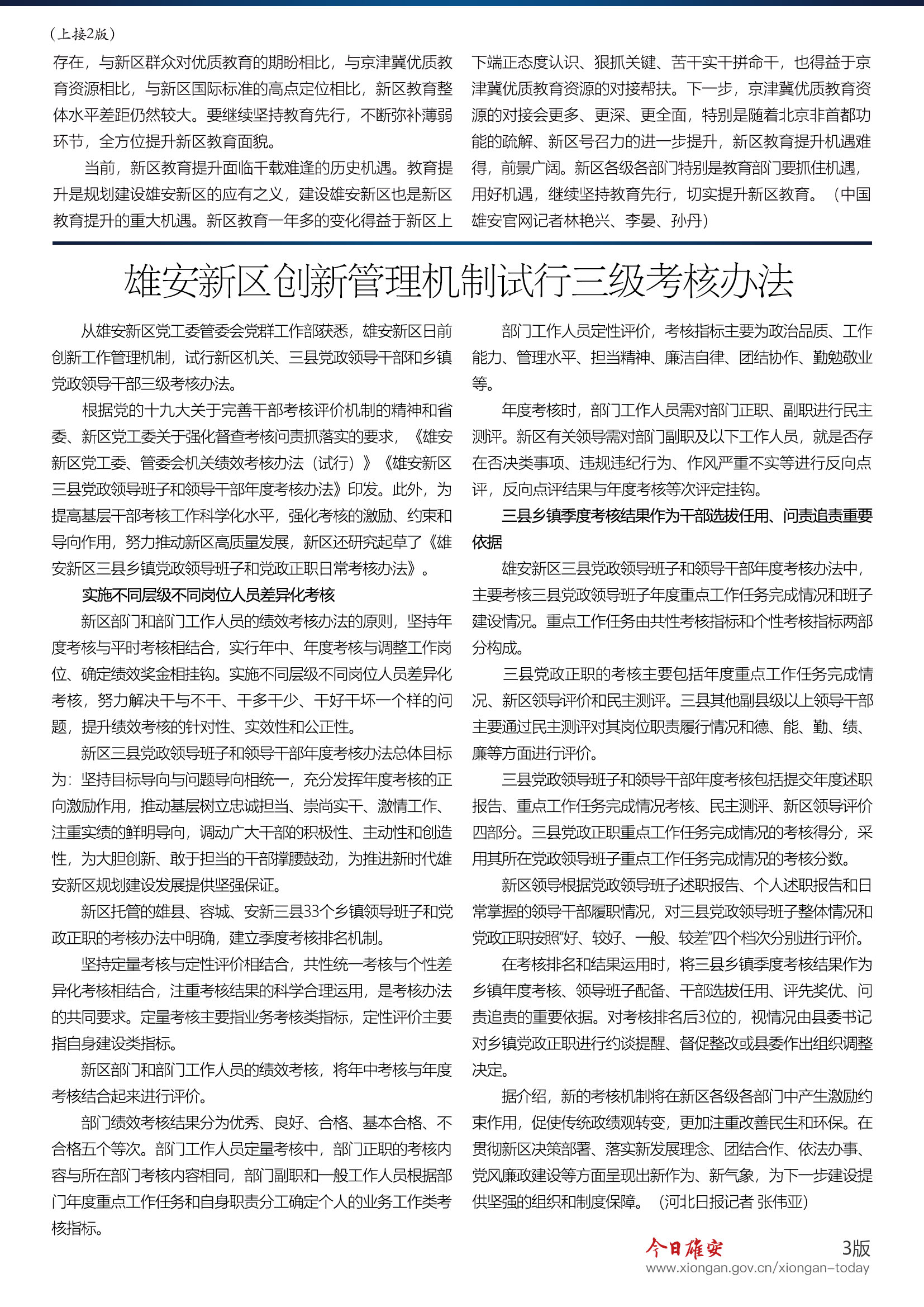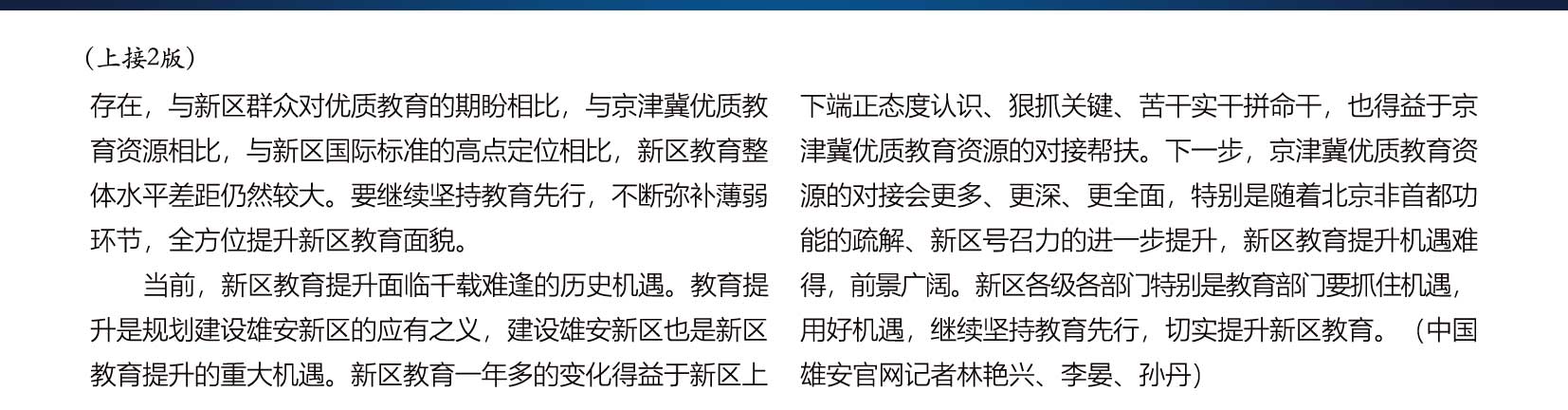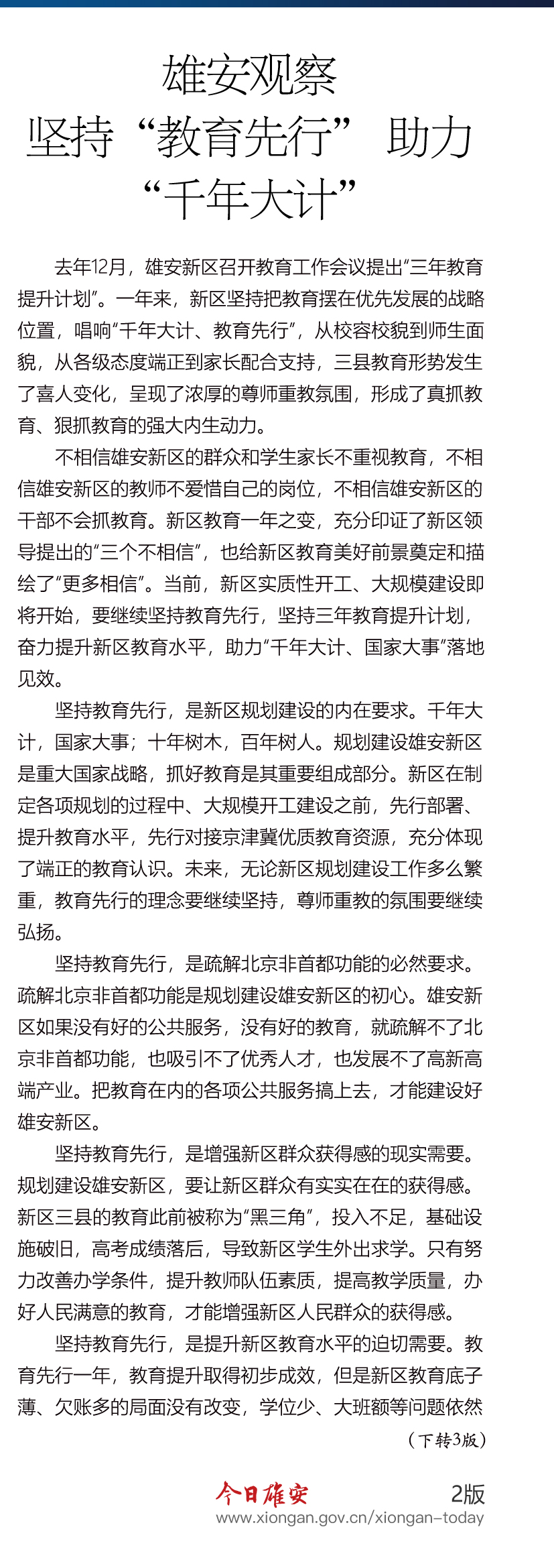 去年12月,雄安新区召开教育工作会议提出“三年教育提升计划”。一年来,新区坚持把教育摆在优先发展的战略位置,唱响“千年大计、教育先行”,三县教育形势发生了喜人变化。