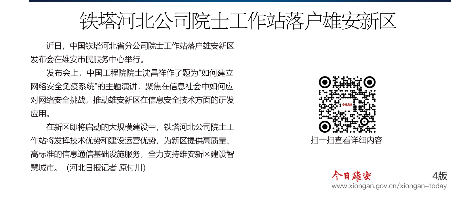 近日,中国铁塔河北省分公司院士工作站落户雄安新区发布会在雄安市民服务中心举行。