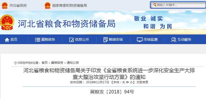 近日,河北省粮食和物资储备局印发《全省粮食系统进一步深化安全生产大排查大整治攻坚行动方案》。自即日起至2019年6月底,该局将对全省粮食系统所有单位、所有场所环节、所有从业岗位进行全覆盖式大排查大整治,对事故隐患零容忍,对存在事故隐患不整改的行为零容忍,坚决遏制各类生产安全事故发生。