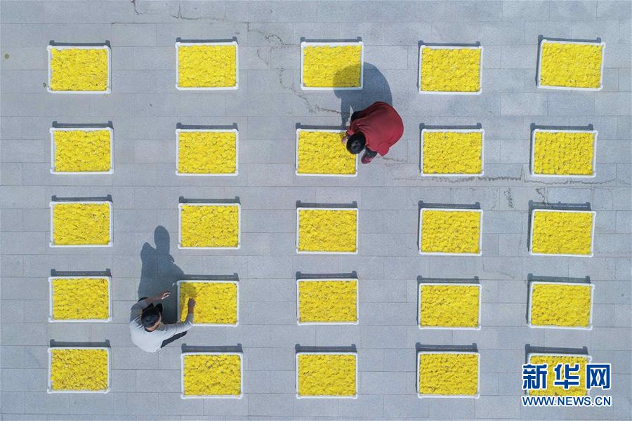 2018年11月7日,河北省魏县魏城镇町上村农民在分拣晾晒菊花。大地之色,俯仰之间;壮美山河,是我的祖国。2018年,新华社记者操纵无人机“飞阅”华夏大地,在最美的时节,定格下她的色彩斑斓。新华社记者 朱旭东 摄