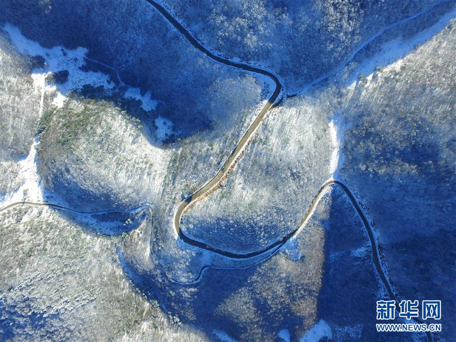 2018年11月18日在湖北省保康县龙坪镇大水林场航拍的雪景。大地之色,俯仰之间;壮美山河,是我的祖国。2018年,新华社记者操纵无人机“飞阅”华夏大地,在最美的时节,定格下她的色彩斑斓。新华社发(杨韬 摄)