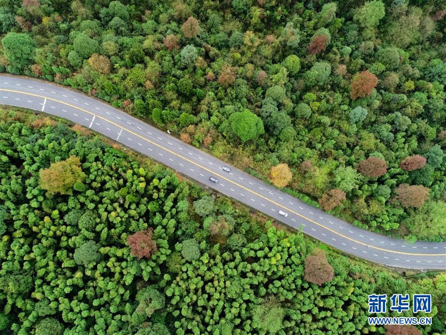2018年11月21日,车辆行驶在国家第一条四车道盘山公路泰井高速上。大地之色,俯仰之间;壮美山河,是我的祖国。2018年,新华社记者操纵无人机“飞阅”华夏大地,在最美的时节,定格下她的色彩斑斓。新华社记者 胡晨欢 摄