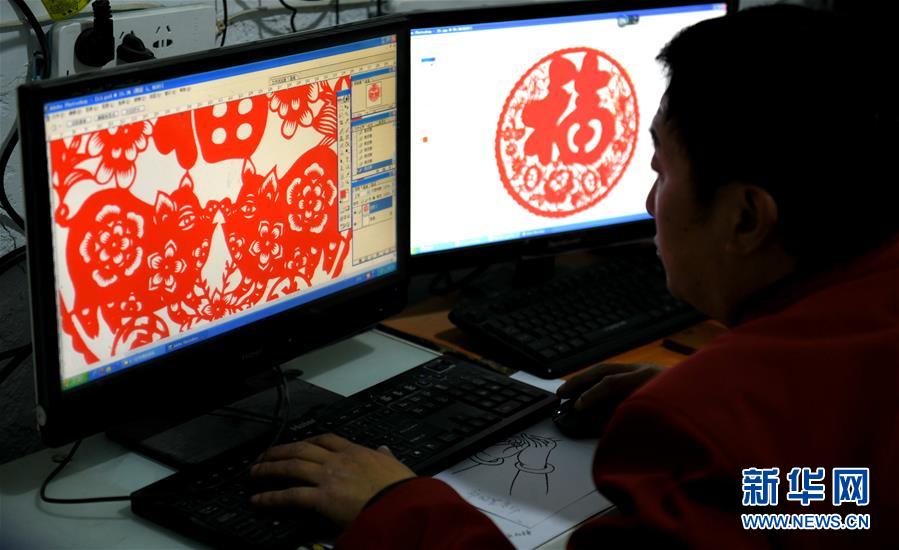 12月19日,在石家庄市无极县的剪纸工作室内,牛世民在用电脑设计新年剪纸作品。 新华社发(陈其保 摄)