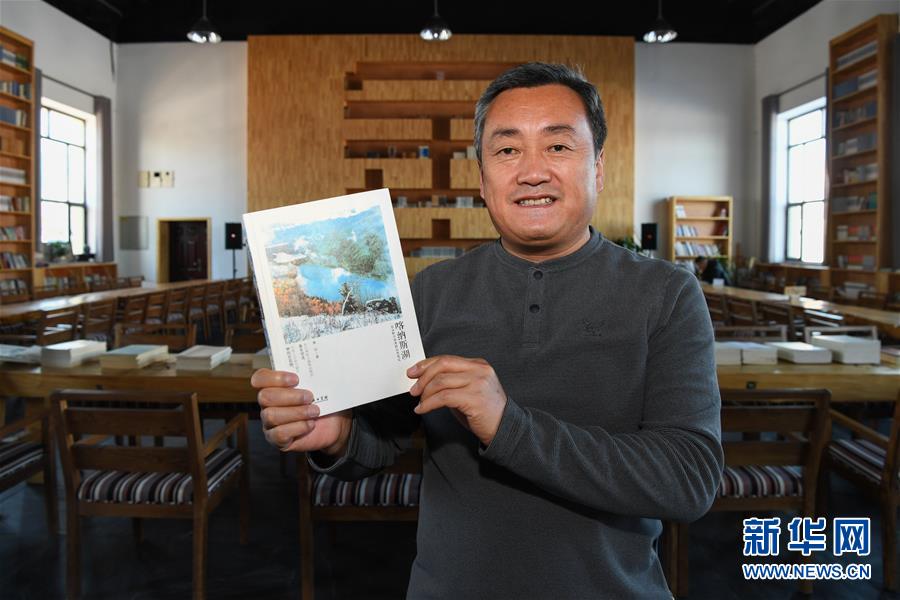 在布尔津县金山书院,院长康剑在介绍他写的《喀纳斯湖——一位山野守望者的自然笔记》(12月21日摄)。新华社记者刘大伟 摄