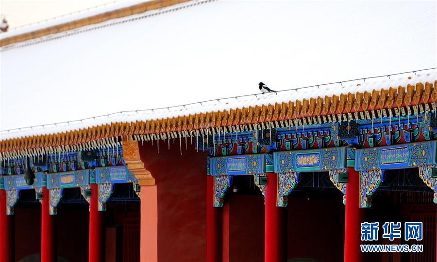 一只小鸟停留在雪后的故宫屋顶(资料照片)。冬日的故宫,既有大气庄重的美丽,也有灵动肆意的生气。新华社发(故宫博物院供图)