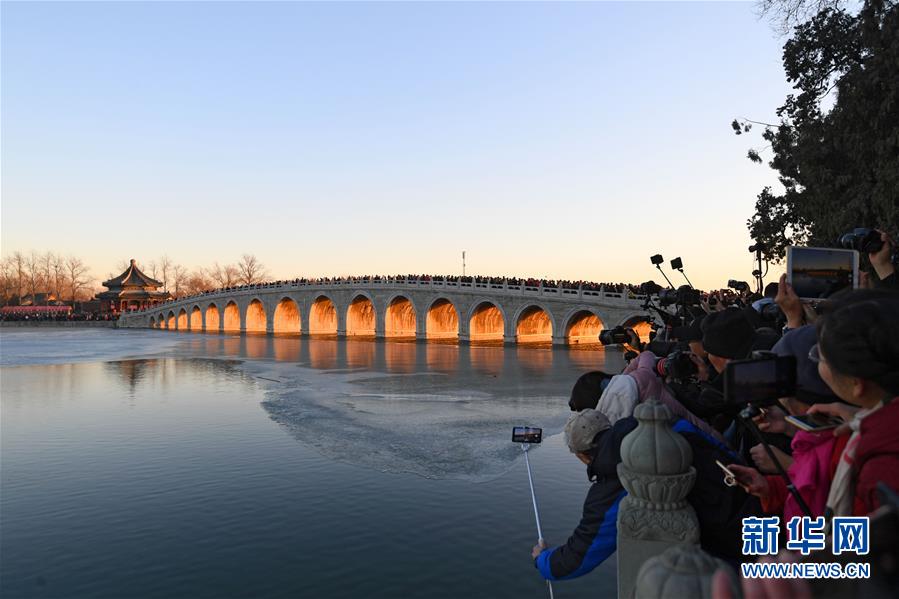 12月23日,游客和摄影爱好者在拍摄颐和园十七孔桥“金光穿洞”美景。 当日,北京颐和园十七孔桥出现“金光穿洞”美景,吸引许多游客和摄影爱好者前来观赏拍摄。 新华社记者陈晔华摄