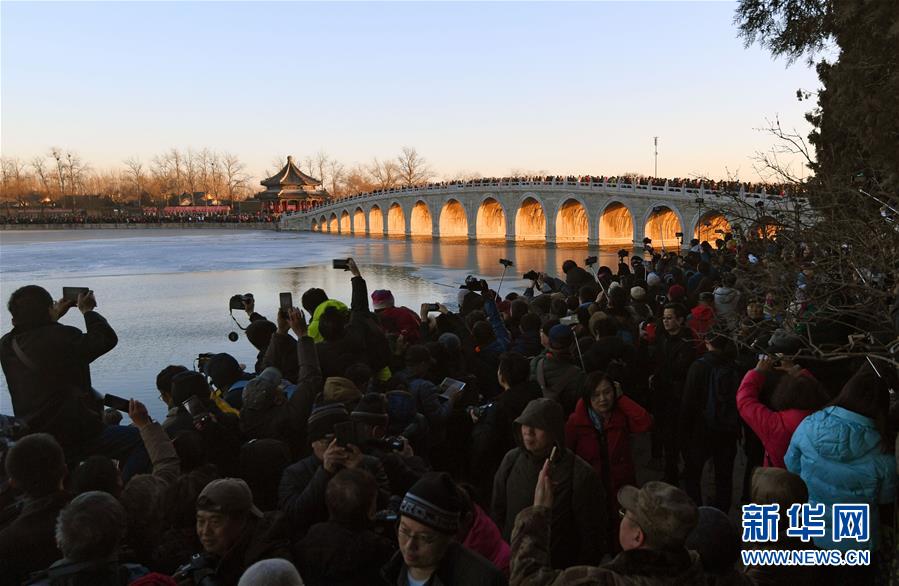 12月23日,游客和摄影爱好者在拍摄颐和园十七孔桥“金光穿洞”美景。 当日,北京颐和园十七孔桥出现“金光穿洞”美景,吸引许多游客和摄影爱好者前来观赏拍摄。 新华社记者陈晔华摄