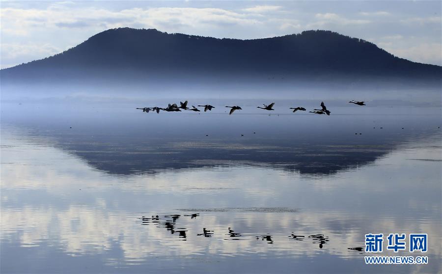 11月4日,一群天鹅在山东荣成天鹅湖上空飞翔。 在即将过去的2018年,各地摄影师用镜头记录下四季中国。大江南北,一幅幅色彩斑斓的美丽画卷徐徐展开。 新华社发(王福东 摄)