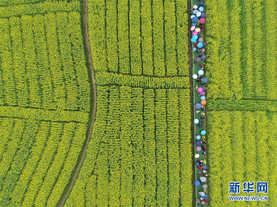 3月17日,游客在湖南省衡阳县库宗桥镇华山村欣赏油菜花(无人机拍摄)。 在即将过去的2018年,各地摄影师用镜头记录下四季中国。大江南北,一幅幅色彩斑斓的美丽画卷徐徐展开。 新华社发(刘欣荣摄)