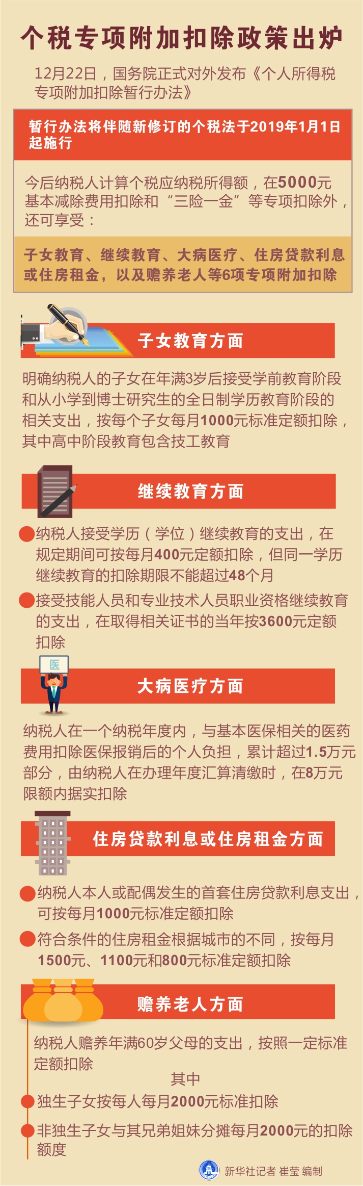 暂行办法将伴随新修订的个税法于2019年1月1日起施行。今后纳税人计算个税应纳税所得额,在5000元基本减除费用扣除和“三险一金”等专项扣除外,还可享受子女教育、继续教育、大病医疗、住房贷款利息或住房租金,以及赡养老人等6项专项附加扣除。如子女教育方面,明确纳税人的子女在年满3岁后接受学前教育阶段和从小学到博士研究生的全日制学历教育阶段的相关支出,按每个子女每月1000元标准定额扣除,其中高中阶段教育包含技工教育。