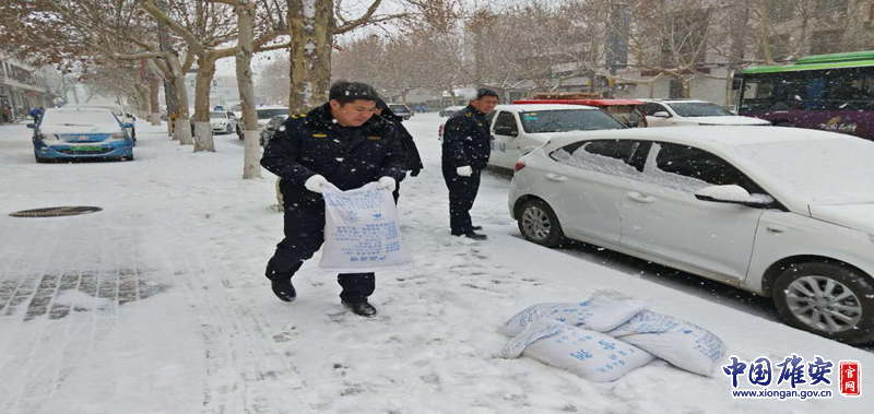 此次行动城管大队紧急出动执法人员20人、执法车辆10辆,并组织环卫工人沿城区主要街道及各学校门口等人员密集路段抛撒融雪制剂,确保广大市民出行安全。
