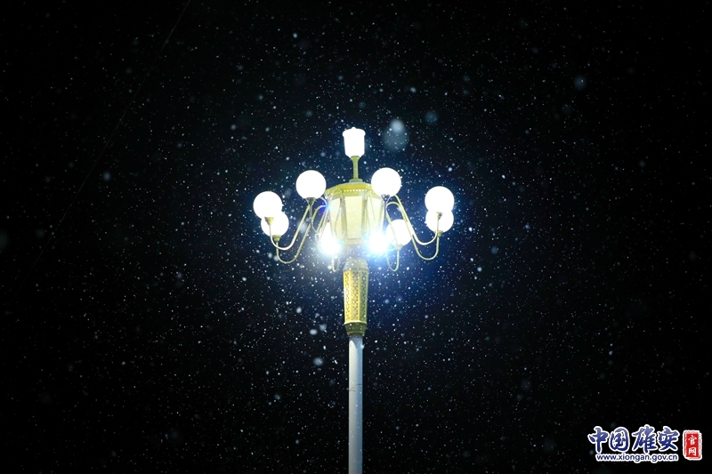 夜幕下,雄安新区街边路灯被雪花笼罩,尽显朦胧之美。中国雄安官网记者王京卓 摄