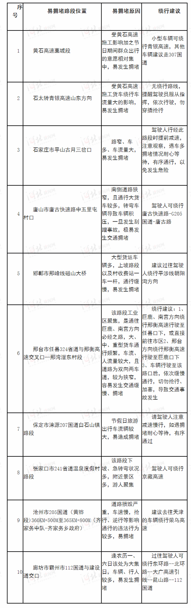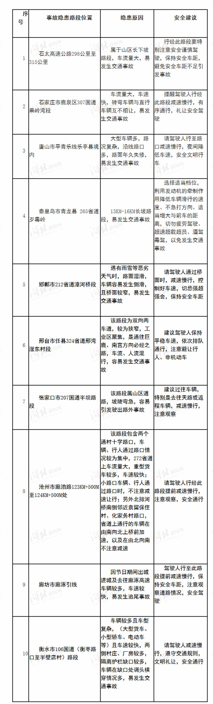2019年元旦假期临近,中短途出行较多,新年庆祝活动密集,易造成交通拥堵或事故多发。河北省交管局汇总了河北省20处易拥堵路段和交通事故多发路段,请广大驾驶人出行前提前了解,主动防范交通安全风险,尽量选择绕行路线。(记者高珊)
