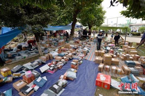资料图:大学生网购的快递纷纷到货,包裹堆满街道。图片来源:视觉中国