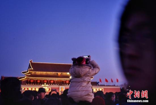 资料图:2018年1月1日,随着晨曦的第一缕阳光照耀在天安门广场,五星红旗冉冉升起。数万民众现场观看了2018年的第一场升国旗仪式。中新网记者 李霈韵 摄