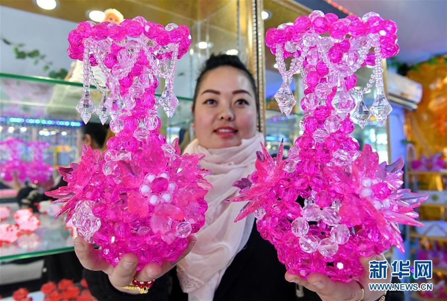 12月28日,在辛集市田家庄乡子曰庄村,村民展示待销的手工艺品。