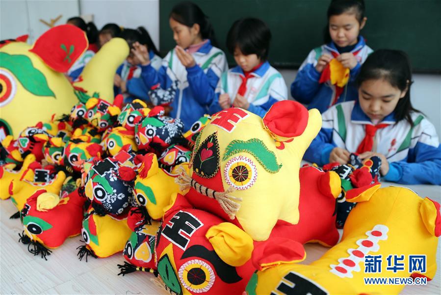12月29日,在山东省滨州市博兴县实验小学,学生在“巧手做布塑 快乐迎新年”活动中制作布老虎。新年临近,人们以各种各样的方式迎接新年,表达对新年的祝福。新华社发(陈彬 摄)