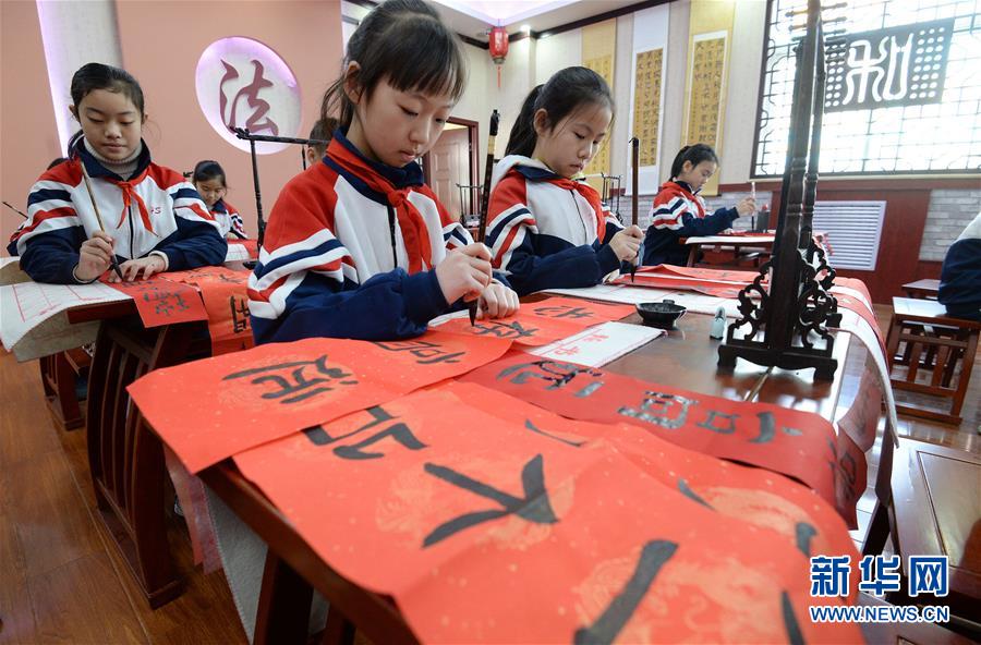 12月28日,河北省邯郸市渚河路小学的学生在“翰墨飘香迎新年”活动上书写对联。新年临近,人们以各种各样的方式迎接新年,表达对新年的祝福。新华社发(郝群英 摄)