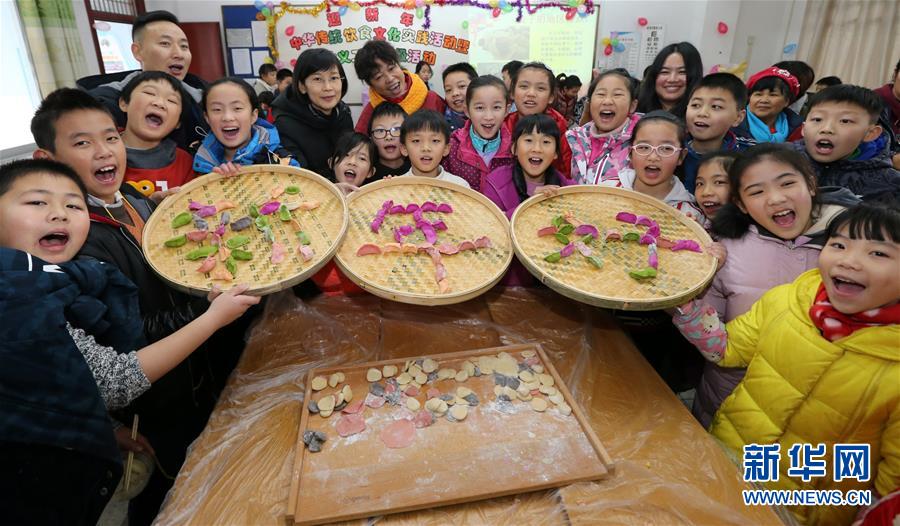 12月29日,广西桂林市中华小学学生和家长用饺子摆出“新年好”字样。新年临近,人们以各种各样的方式迎接新年,表达对新年的祝福。新华社发