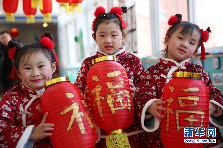 12月29日,安徽省淮北市凤凰幼儿园的孩子们在民俗迎新年活动中手拿红灯笼拍照。新年临近,人们以各种各样的方式迎接新年,表达对新年的祝福。新华社发(李鑫 摄)