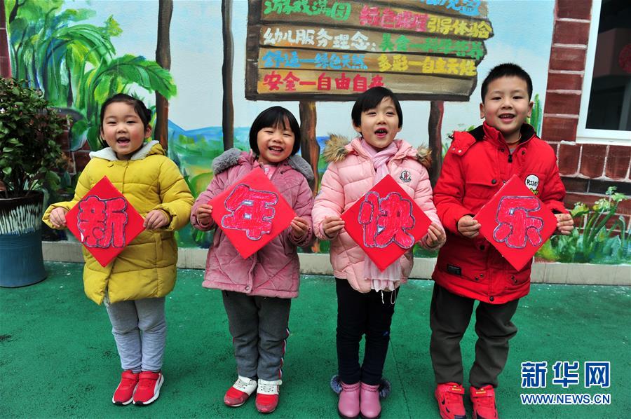 12月29日,湖北省秭归县金苹果幼儿园的孩子们在展示“新年快乐”字样。新年临近,人们以各种各样的方式迎接新年,表达对新年的祝福。新华社发(王辉富 摄)