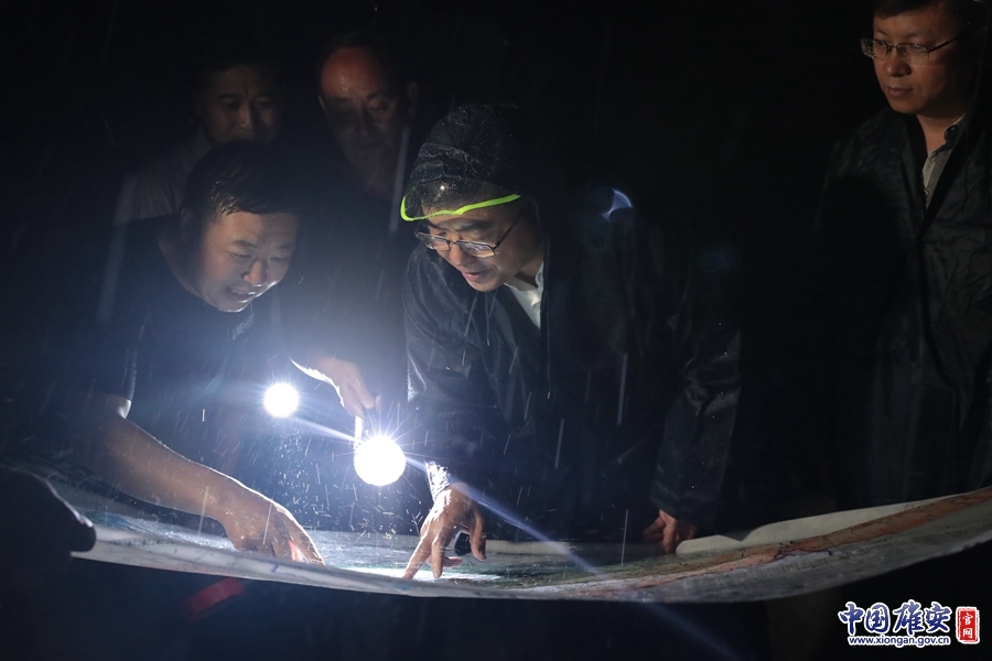 8月11日晚,河北省委常委、副省长,雄安新区党工委书记、管委会主任陈刚冒雨深入白沟引河入淀口,调研检查水情和防汛值守情况等防汛工作(2018年8月11日摄)。中国雄安官网记者刘东尧 摄