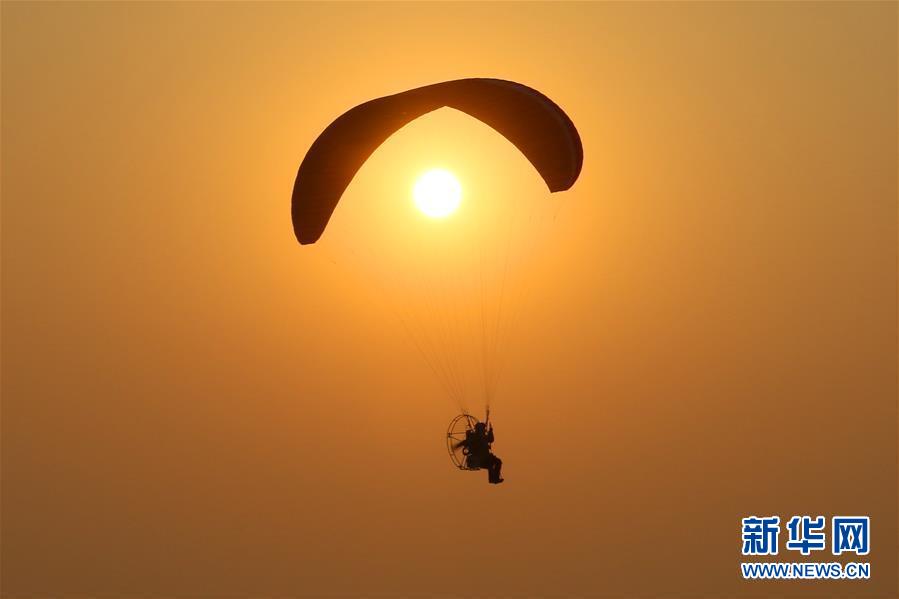2019年1月1日,在山东省日照市万平口景区,一名动力伞爱好者沐浴朝阳的光辉。